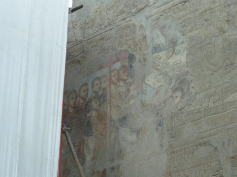 壁を良く見ると、エジプトの壁画の上から何かが塗られ、